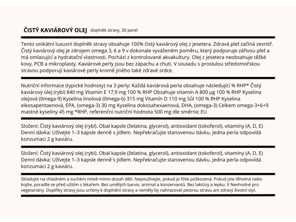 Složení: 100% čistý kaviárový olej (jeseter), kapsle (mořská rybí želatina, glycerol), antioxidant (tokoferol)